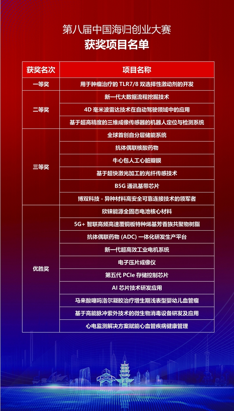 2022(第八屆)中國海歸創業大賽貫徹落實習近平總書記在中央人才工作會議上提出的深入實施新時代人才強國戰略、加快建設世界重要人才中心和創新高地的要求,以及給南京大學留學歸國青年學者的回信精神,圍繞高水平科技自立自強和經濟社會高質量發展的需要,進一步加強平臺開放,采用部委指導、協會統籌、地方承接、合作辦賽的新型機制,由留創園工委會聯合江蘇省高新技術創業服務中心、蘇州國家高新區管委會等7家單位共同主辦,另有20多家各地單位協辦,發揮地方資源稟賦優勢,在空間、政策、資本、產業對接等方面進一步提升服務能級,支持更多優質海外項目和海歸人才落地實施成果轉化和科技創業。本屆大賽自7月啟動以來,經項目報名和初審、公示,共有119個海歸項目團隊入圍復賽。復賽于2022年12月29日—30日采用線上形式舉行,將通過路演、評審產生20個項目晉級決賽。2023年1月13日,由中國技術創業協會留學人員創業園工作委員會聯合江蘇省高新技術創業服務中心、蘇州國家高新區管委會等7家單位共同主辦的第八屆中國海歸創業大賽決賽在蘇州高新區落下帷幕。
